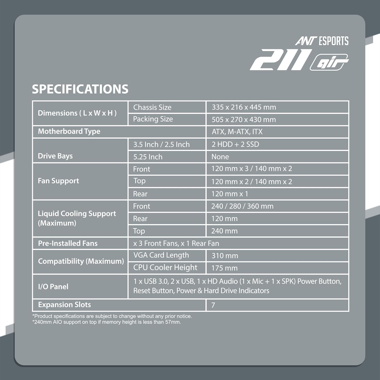 Ant Esports 211 Air Mid-Tower Cabinet – Black