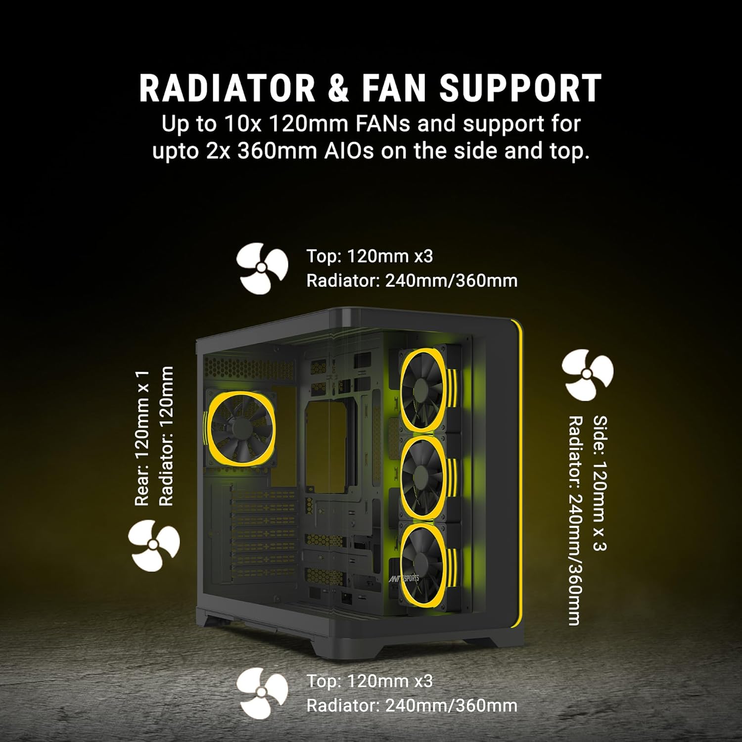 Side: 120mm x3 Botton: 120mm x3 Rear: 120mm x1 |