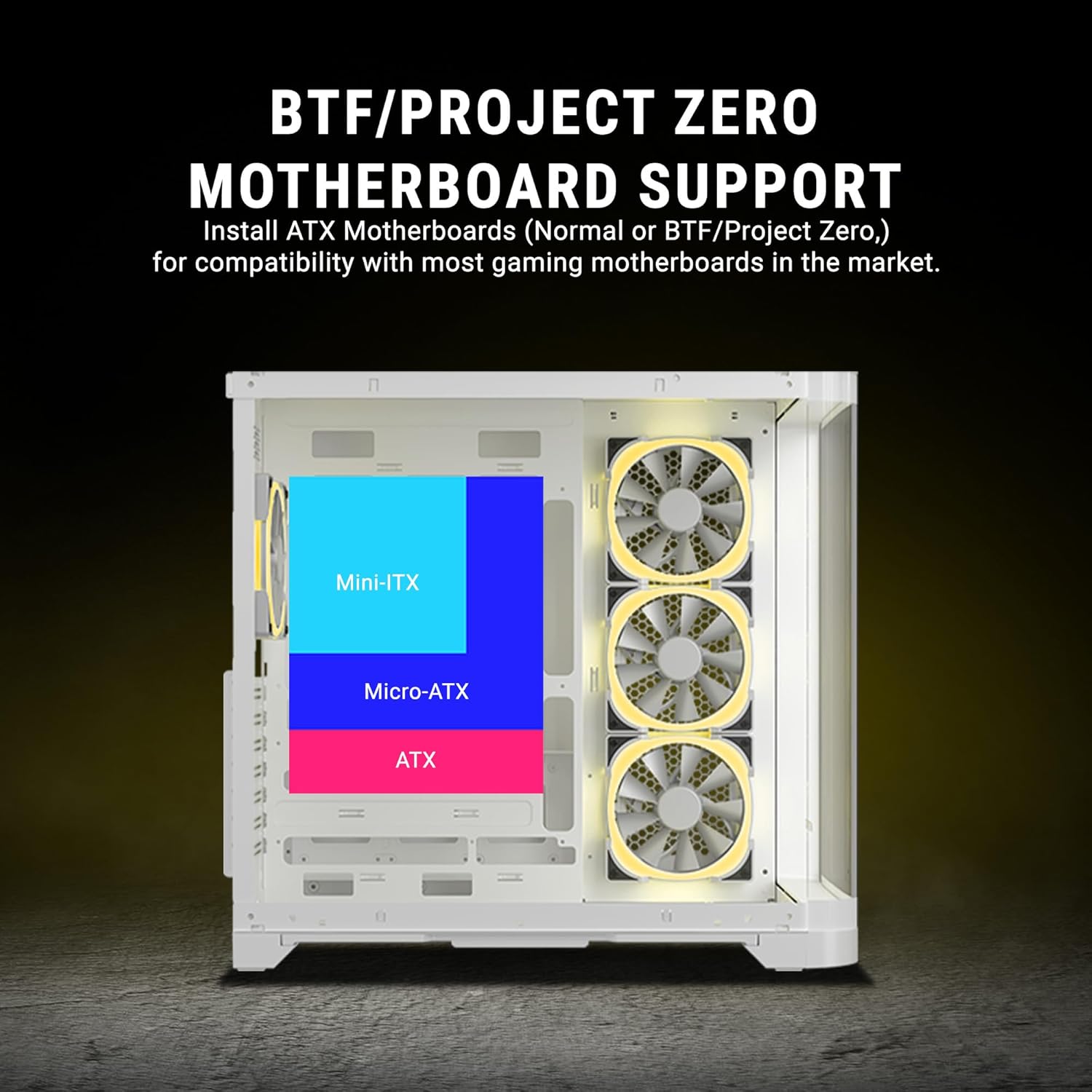 | Compatible Devices | ATX, Micro-ATX, Mini-ITX motherboards, ASUS BTF, MSI Project Zero motherboards, up to 360mm radiator mounts |