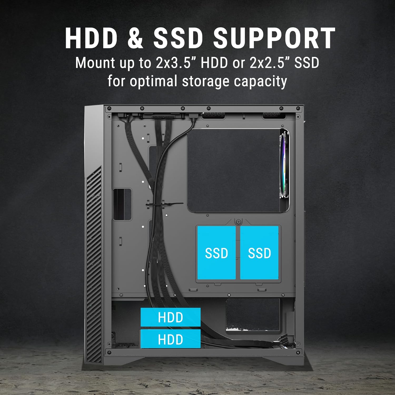 | Drive Bays | 3.5 Inch / 2.5 Inch: 2 HDD + 2 SSD, 5.25 Inch: None |
