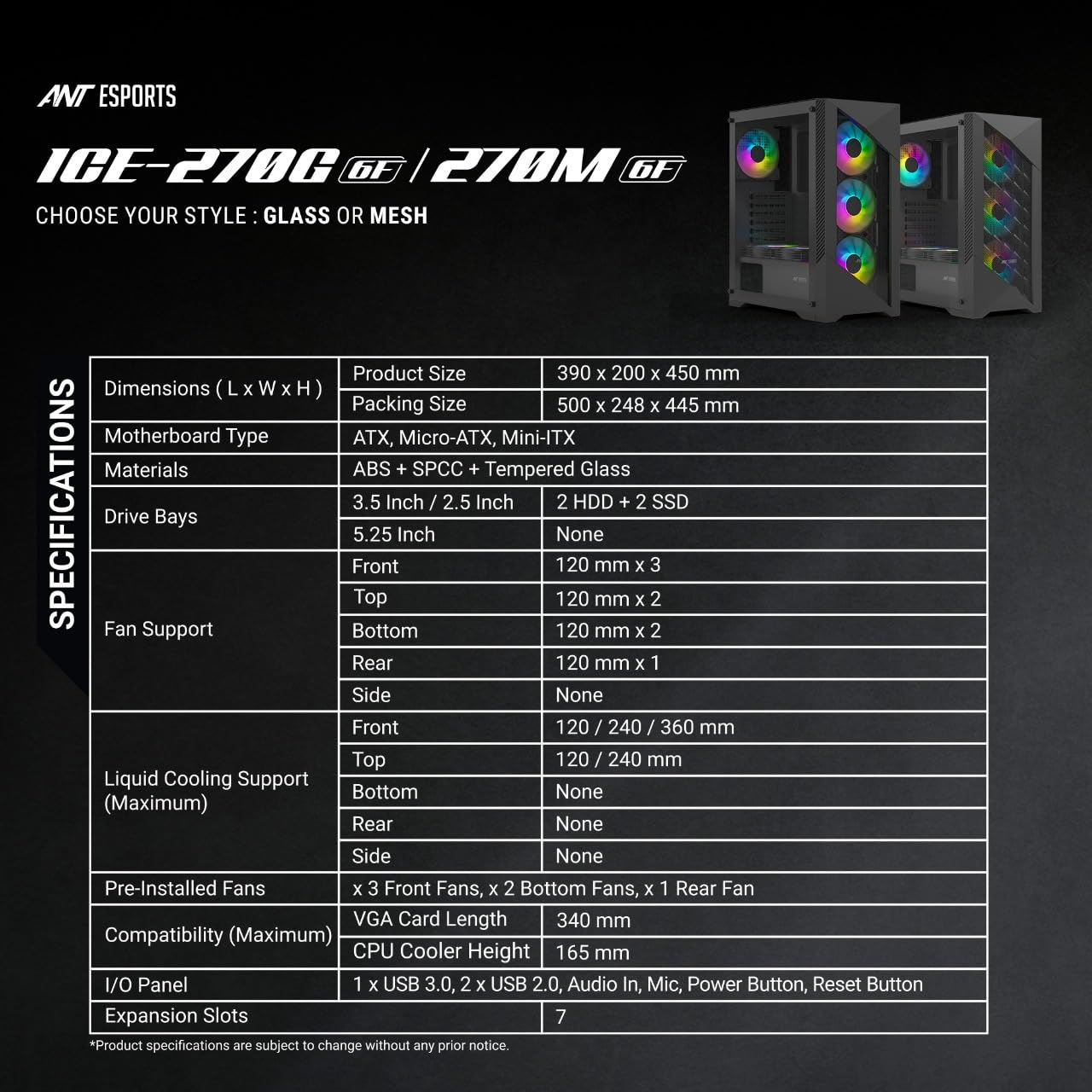 Ant Esports ICE- 270M 6F (Pre-Installed 6 Static RGB Fans) Cabinet- Black
