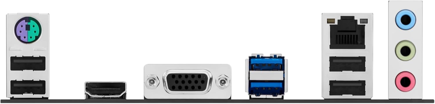 | Back Panel I/O Ports | 2 x USB 5Gbps ports (2 x Type-A) 4 x USB 2.0 ports (4 x Type-A) 1 x VGA port 1 x HDMI port 1 x Realtek 1Gb Ethernet port 3 x Audio jacks 1 x PS/2 keyboard/mouse combo port |